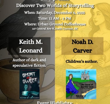 Keith will be on hand Saturday, December 6 from 11AM - 2PM to chat about his speculative fiction, diving into the darker, thought‑provoking side of his craft featured in Short Not Sweet, Coffee Fiction Series - Book 1. For those who prefer lighter tales, Keith also writes enchanting children’s stories under the pen name Noah D. Carver, including whimsical adventures like The Secret of Sparkles’ Cove.
